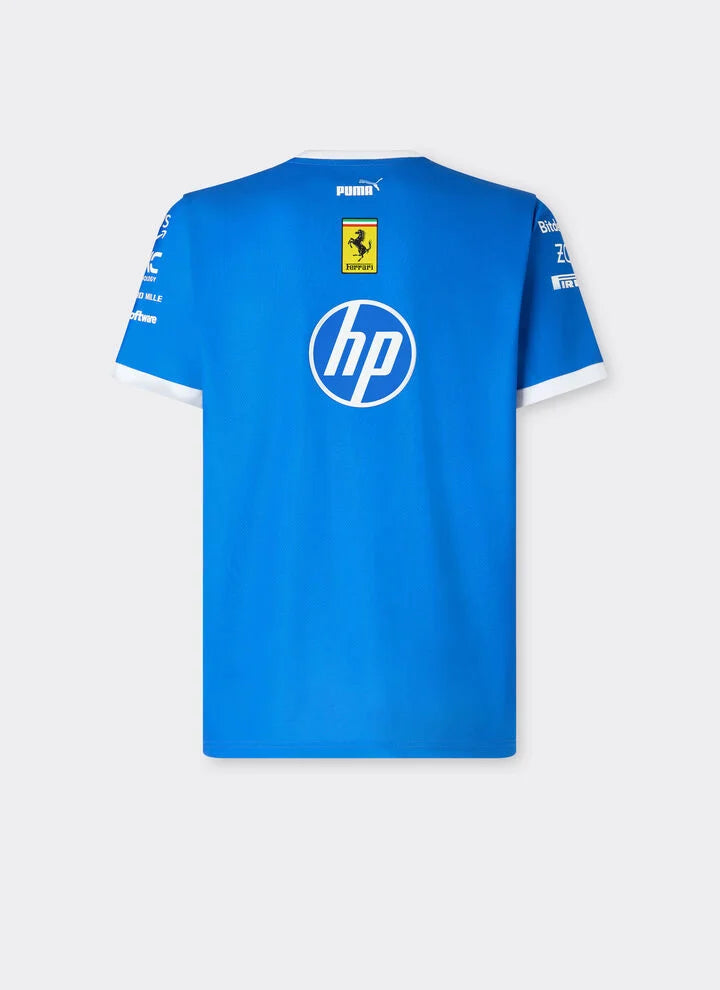 This T-shirt reproduces the model worn by the Scuderia Ferrari HP Team trackside during the 2025 Monza Grand Prix. A special edition created to celebrate the anniversary of Niki Lauda's first world title won at Monza in 1975 as well as the first time Charles Leclerc and Lewis Hamilton raced on the home circuit as teammates. A symbol of sporting passion and team spirit, the model is made of breathable technical fabric. Distinguished by a blue background, crew neck and short sleeves with a contrasting white stripe. The design is completed by sponsor logos and the iconic Ferrari Trademark, which recalls the aesthetics of the rectangular logo used in racing styles from the ‘70s.